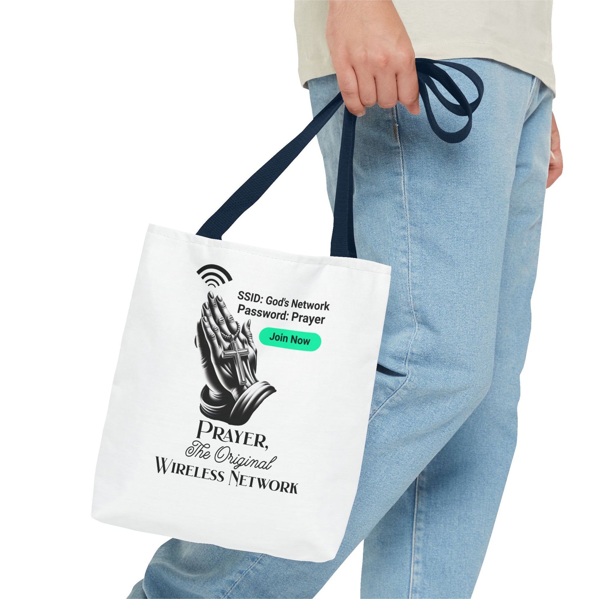 This Tote Bag features a unique design with praying hands and a wifi signal, paired with the slogan Prayer, The Original Wireless Network. It gives a spiritual and tech-savvy vibe, perfect for those who appreciate the power of faith and connectivity. Ideal for religious holidays and everyday use.